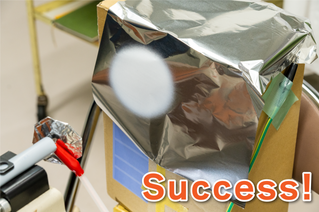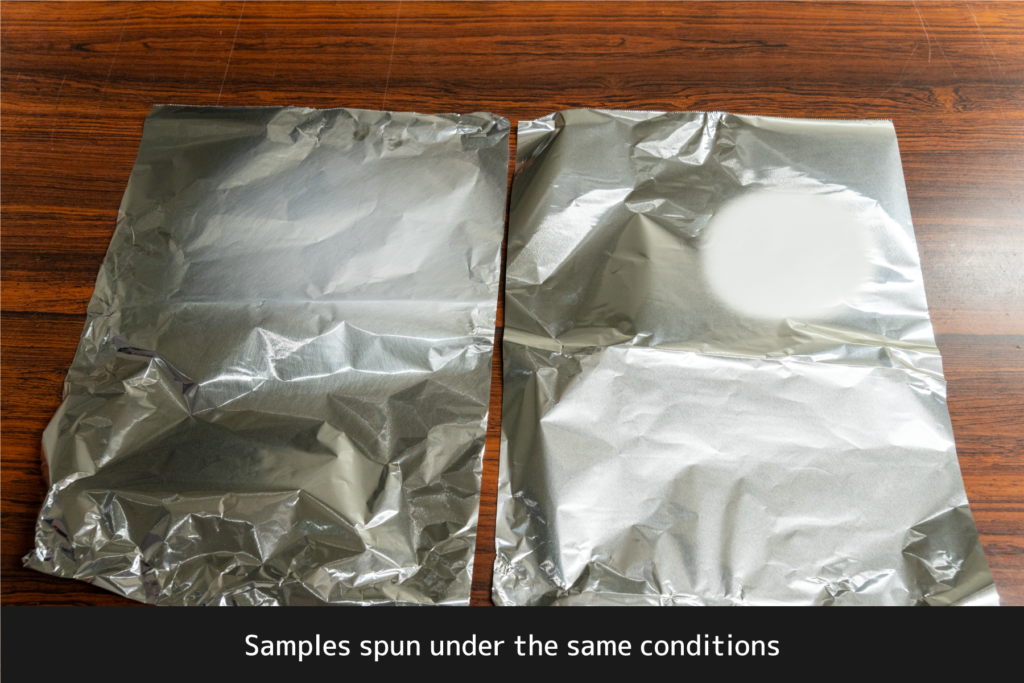 Following the advice of Researcher Nogami, we attached aluminum foil around the needle in a shape resembling a parabolic antenna. As a result, the jet oriented itself toward the collector, and we successfully spun fibers onto the aluminum foil of the collector.